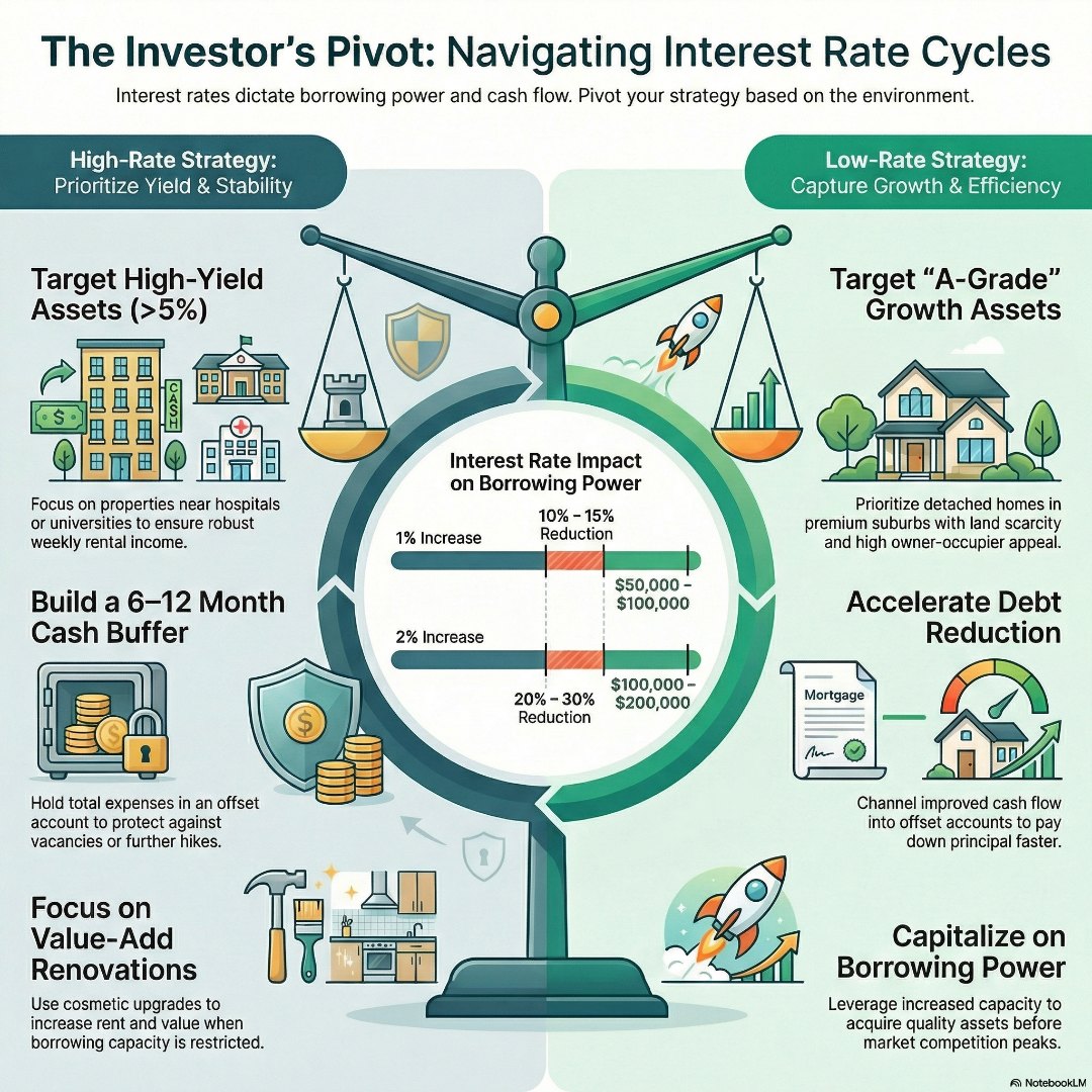 Every 1% jump in rates generally reduces borrowing capacity by 10-15%. For many, this equates to $50,000-100,000 less to invest, as lenders must stress-test your repayments at higher levels, thereby cutting your ability to borrow.
