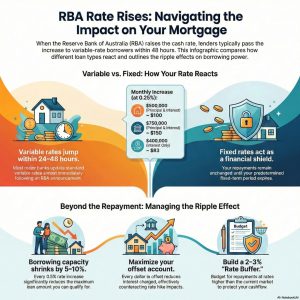 Offset accounts become increasingly valuable during rising rate environments. Every dollar in your offset account reduces the interest charged on your loan, effectively providing a return equal to your mortgage rate. Maximising offset balances can partially counteract rate increase impacts.