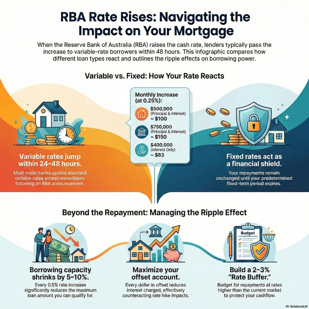 If you have a variable rate mortgage, your repayments will likely increase when the RBA raises interest rates. Banks typically pass on these rate rises within days or weeks of an RBA announcement. However, if you’re on a fixed-rate mortgage, your repayments remain unchanged until your fixed term expires. A 0.25% rate increase on a $500,000 loan typically adds around $100 to monthly repayments.