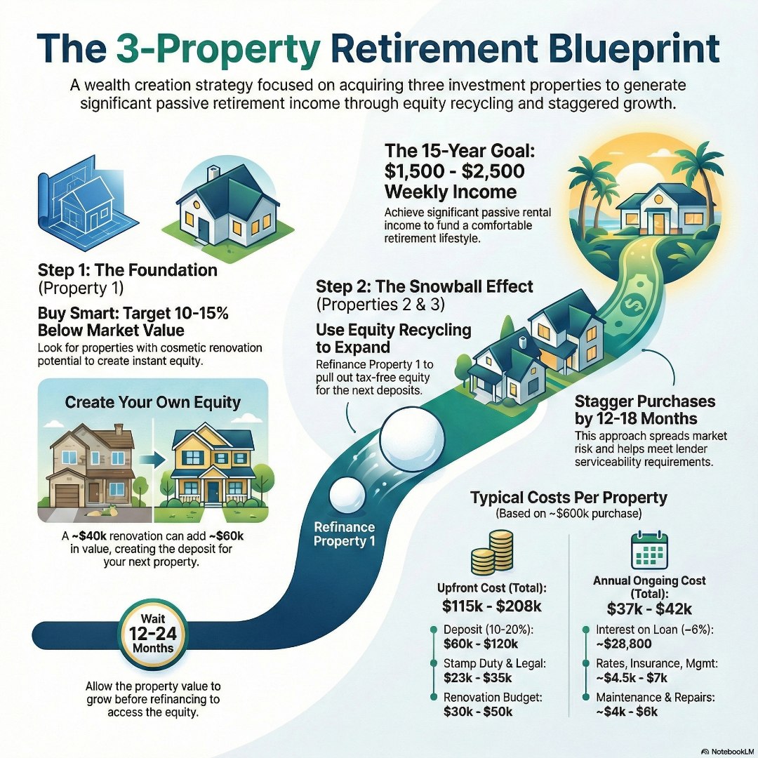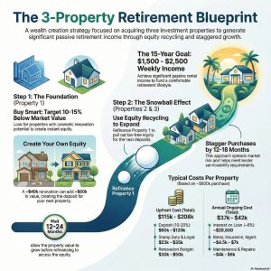 Building a 3-property retirement plan represents one of the smartest wealth-creation strategies for Australians approaching their 50s, but it demands careful planning, realistic budgeting, and strategic execution. For most investors, this approach offers the perfect balance between manageable risk and substantial passive income potential typically generating $1,500-$2,500 per week in rental income within 10-15 years. However, success hinges on understanding the true costs involved and implementing proven strategies that maximise capital growth while maintaining cash flow neutrality. The key lies in starting with the right foundation property, leveraging equity strategically, and planning for both upfront investments and ongoing expenses that can easily reach $50,000-$80,000 annually across three properties.