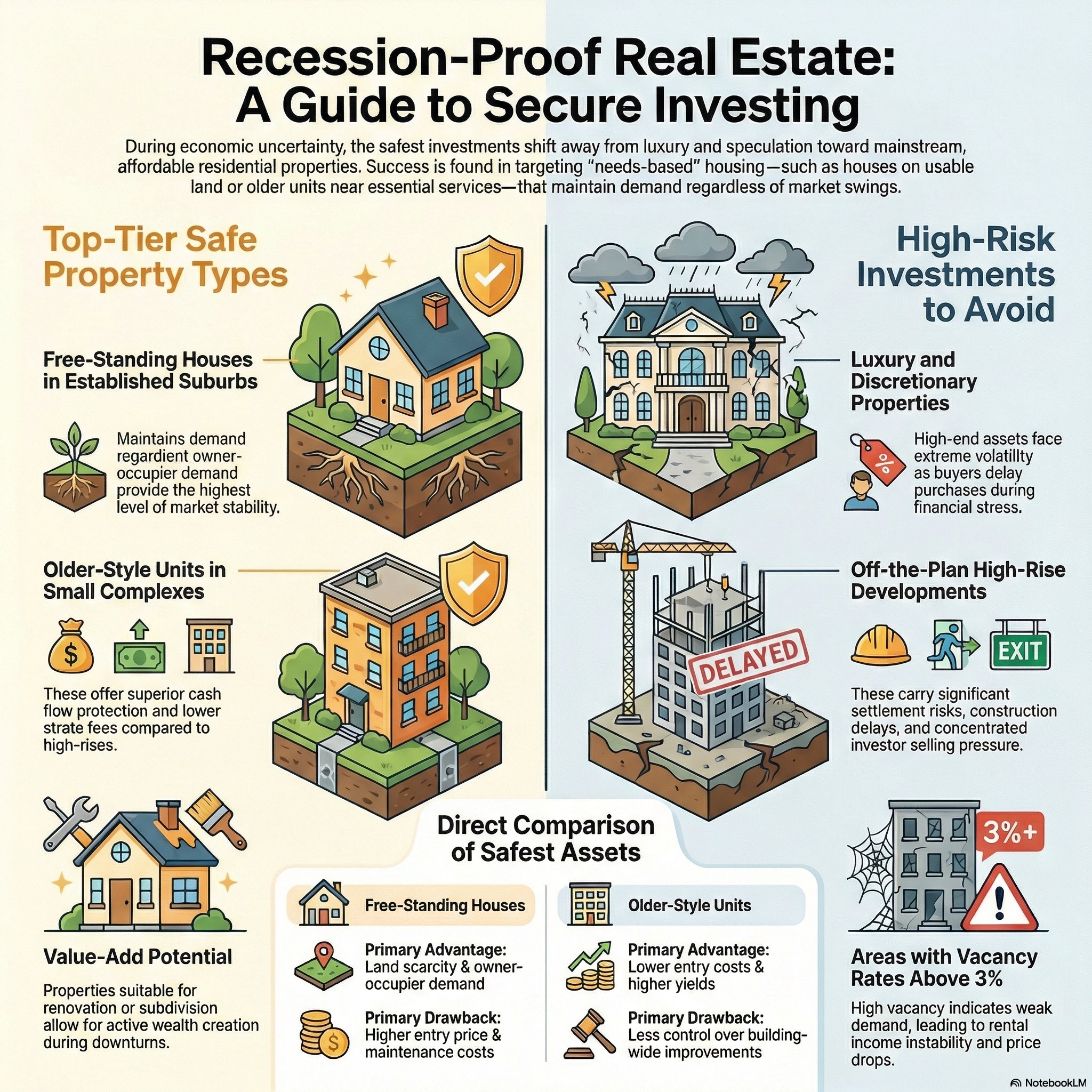 The critical factor remains avoiding high-risk property types regardless of their initial appeal. During economic uncertainty, preservation of capital takes priority over maximum returns. Properties that offer steady rental income, moderate capital growth potential, and limited downside risk form the foundation of resilient investment portfolios.