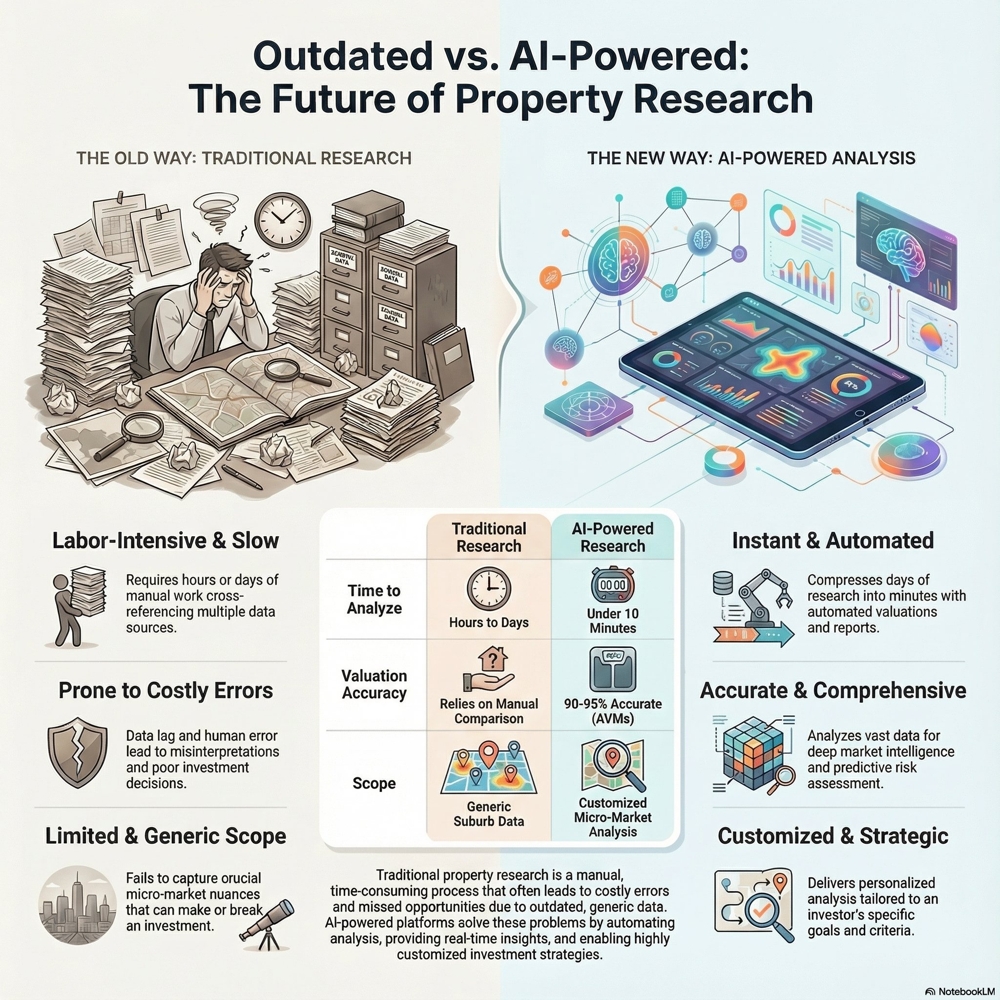 • Traditional property research is slow, manual, and prone to costly errors that can derail investment decisions